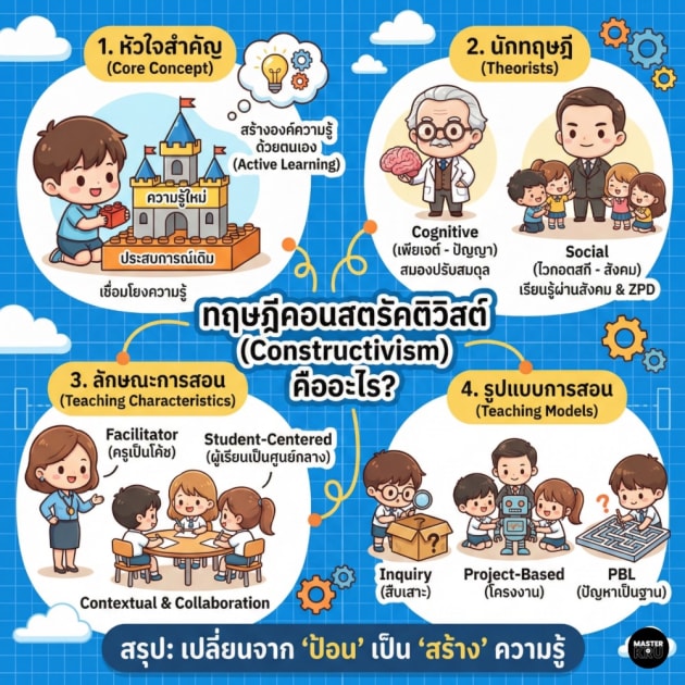 สรุปสั้นๆ: Constructivism คือการเปลี่ยนบทบาทจากการ "ป้อนความรู้" เป็นการ "สร้างสิ่งแวดล้อมให้ผู้เรียนสร้างความรู้เอง" โดยอาศัยประสบการณ์เดิมและการปฏิสัมพันธ์กับคนรอบข้างครับ